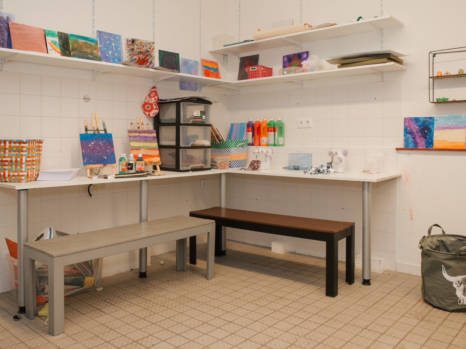 Binnen is er net zoveel inspiratie. Er is een fijne, open ruimte met veel materialen om te schilderen, tekenen en knutselen. Ook hier zie je de Montessori-visie terug: kinderen maken eigen keuzes, voeren activiteiten zelfstandig uit en ruimen daarna zelf op. Dat past perfect bij deze leeftijd.